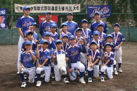 優勝した三小メッツCの選手たち、スポ少市部第一ブロックの 三鷹・東久留米の各選抜チームと戦って勝ち抜くと, 10月中旬からのスポ少秋季都大会へ出場できます. さらに、11月3日開催の東京都知事杯第8回東京都軟式野球 マクドナルド・ジュニアチャンピオンシップに出場します。