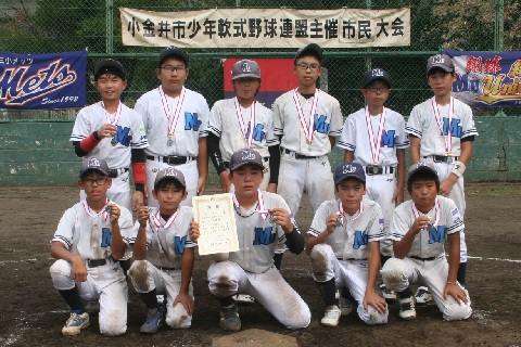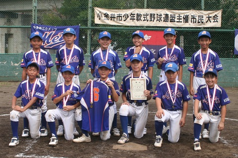 ![]() 優勝した三小メッツAの選手たち、、スポ少市部第一ブロックの 三鷹・東久留米の各選抜チームと戦って勝ち抜くと, 10月中旬からのスポ少秋季都大会へ出場できます. ![]() 準優勝した緑小ユニオンズAの選手たち いずれも9月14日武蔵野公園二枚橋野球場にて。 |