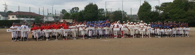 このあと各団から選出されたオール小金井チームに参加する選手たちと、女子オール小金井・国分寺合同チームに参加する選手たちの紹介が行われました。 ![]() オール小金井の選手たち. ![]() 女子オール小金井・国分寺合同チームに参加の選手たち. 開会式の後は同グランドにおいてA,B,Dの三面を使って、初回戦11試合が行われました。 六年の部と四年の部の優勝者はスポーツ少年団秋季都大会への出場権をかけて市部第一ブロックの選考会に出場します。 五年の部の優勝者は東京新聞杯争奪第42回東京都学童新人戦と、第13回赤い羽根少年野球大会に小金井代表として出場します。 五年の部の準優勝者は第29回東京都知事杯台東/墨田学童野球大会に小金井代表として出場します。 四年の部の優勝者は第7回東京都知事杯マクドナルドジュニアトーナメントに小金井代表として出場します。 |
